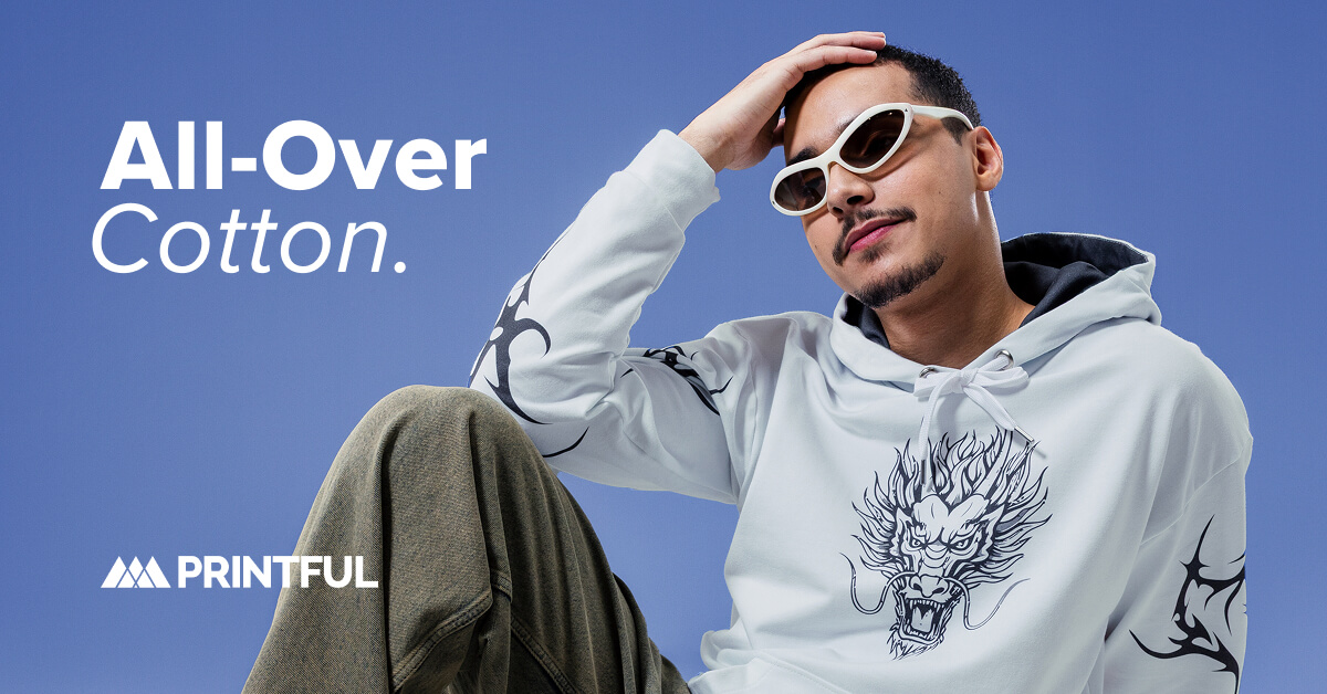 Printful’s All-Over Cotton Collection redefines what’s possible in on-demand production. It features premium 100% cotton tees and cotton-rich fleece, produced with precision using Direct-to-Fabric printing.
